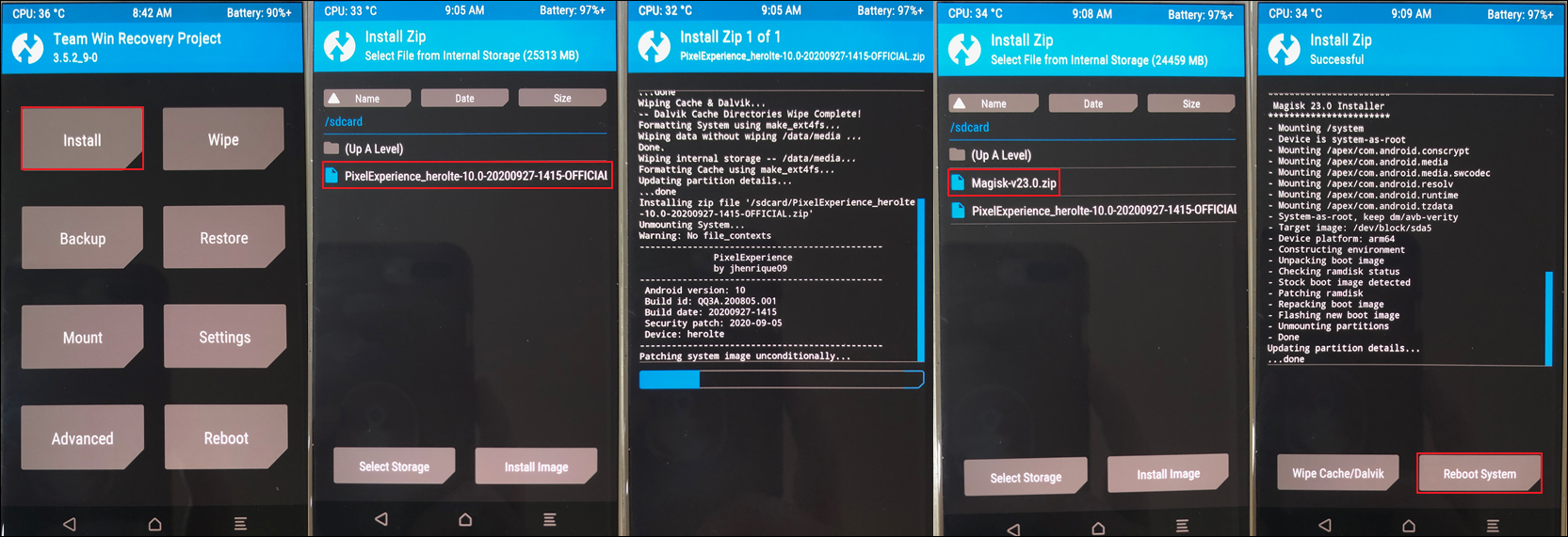 Install --> Pixel 롬 플래싱 --> Magisk Rooting(옵션) --> Reboot System