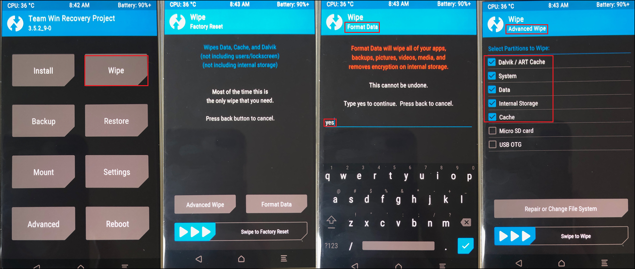 WIPE --> Format Data --> yes --> Advancde Wipe --> Dalvik / ART Cache / System / Data / Internal Storage / Cache 선택하여 Wipe 진행해줍니다.