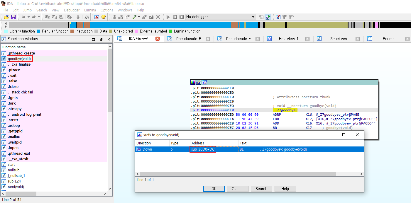 arm64 "libfoo.so" 파일을 열어서 goodbye() 함수 정보를 확인합니다. goodbye 함수는 sub_30D0 함수에서 호출하고 있습니다.
