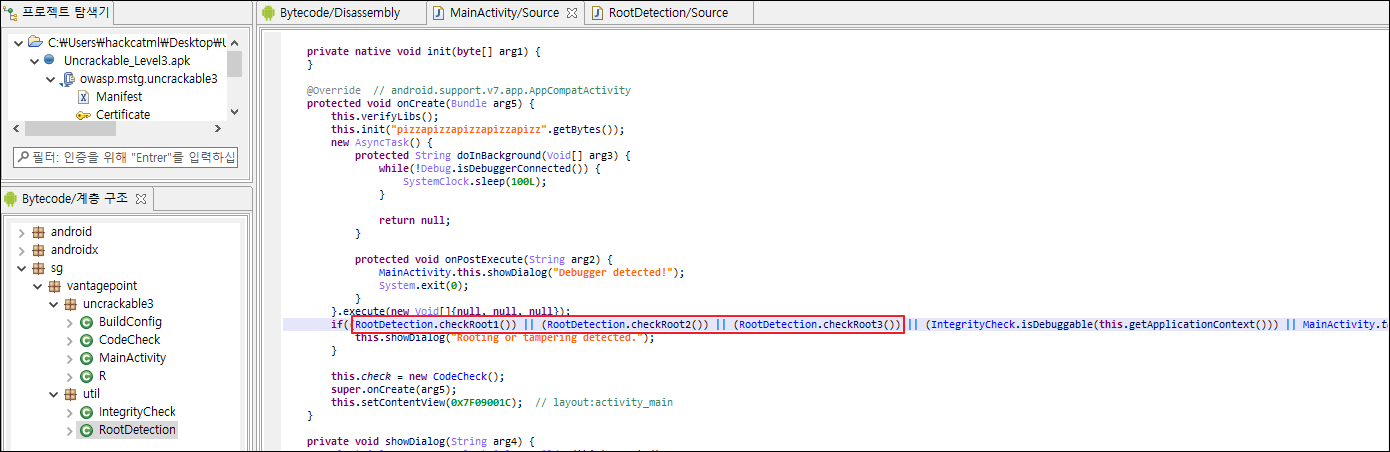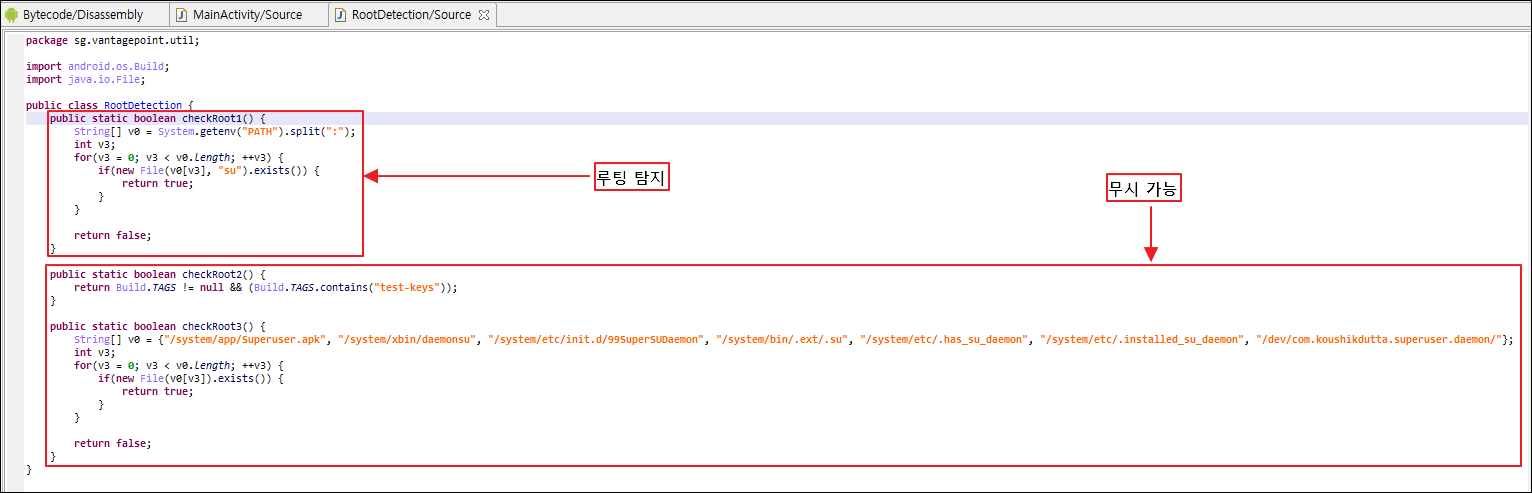 이제 루팅탐지 우회를 위해 apk파일을 까보면 RootDetection 클래스의 checkRoot1, checkRoot2, checkRoot3 메서드가 루팅 탐지 역할을 하는것을 알 수 있습니다.