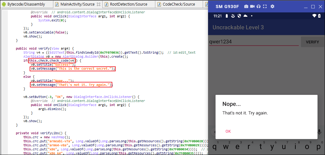 이제 화면에 아무값이나 입력해서 반응을 살펴봅니다. "Nope..." 문구가 출력되는데 해당 문자열은 MainActivity에서 찾을 수 있습니다. 또한 if 문의 this.check.check_code(v4) 값이 true가 되면 "Success!" 문구가 출력되는것을 알 수 있습니다.