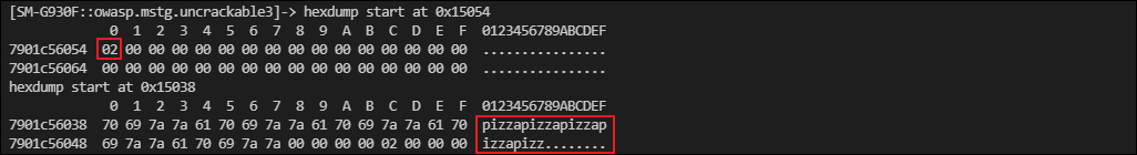 다음과 같이 "dword_15054" 에는 0x02가 들어있고, "qword_15038" 에는 24자리의 문자열 "pizzapizzapizzapizzapizz" 이 들어있습니다.