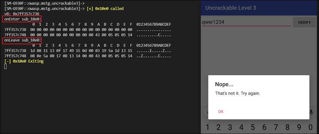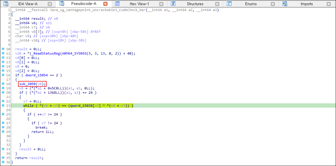 실행결과 sub_10e0함수를 들어오고 나갈때 v8 주소값에 들어있는 값에 분명한 차이가 있습니다.