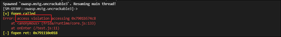 그러나 access violation이 발생하면서 앱이 죽습니다. 이는 frida가 메모리에 접근하지 못하여 발생하므로 Memory의 접근권한을 우선적으로 설정해줄 필요가 있습니다.