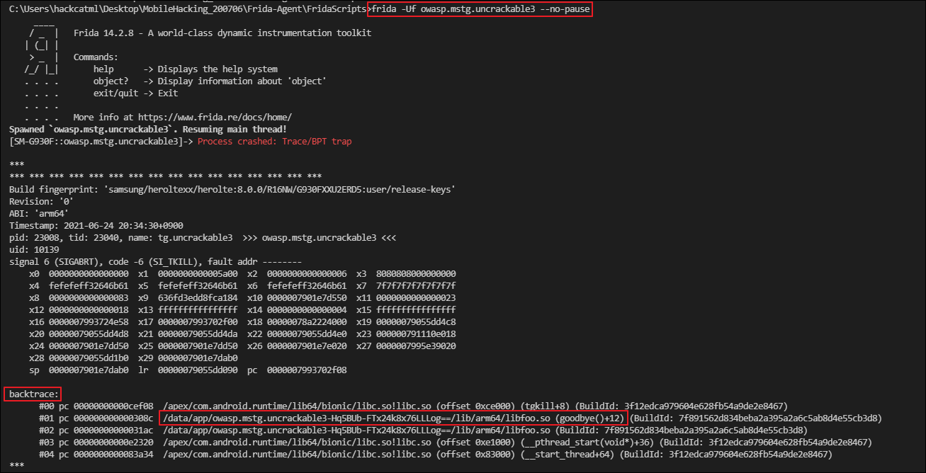 앱 크래시가 발생하는데, backtrace에 "/data/app/owasp.mstg.uncrackable3-Hq5BUb-FTx24k8x76LLLog==/lib/arm64/libfoo.so (goodbye()+12)" 정보가 찍혀 있습니다.
