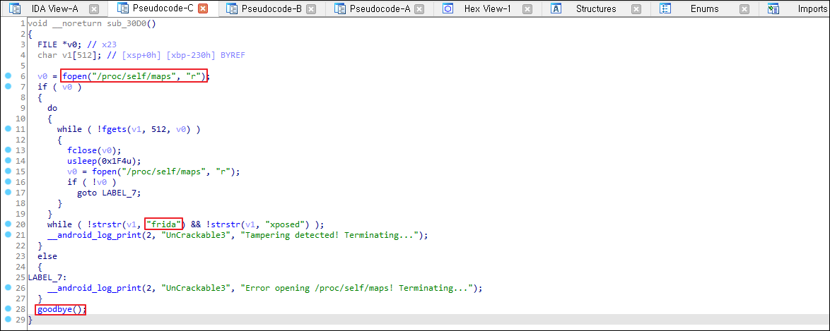 "/proc/self/maps" 파일에 "frida" 문자열이 있거나, fopen함수가 파일을 제대로 열지 못한 경우에는 goodbye() 함수를 호출하여 앱을 종료시키고 있습니다.