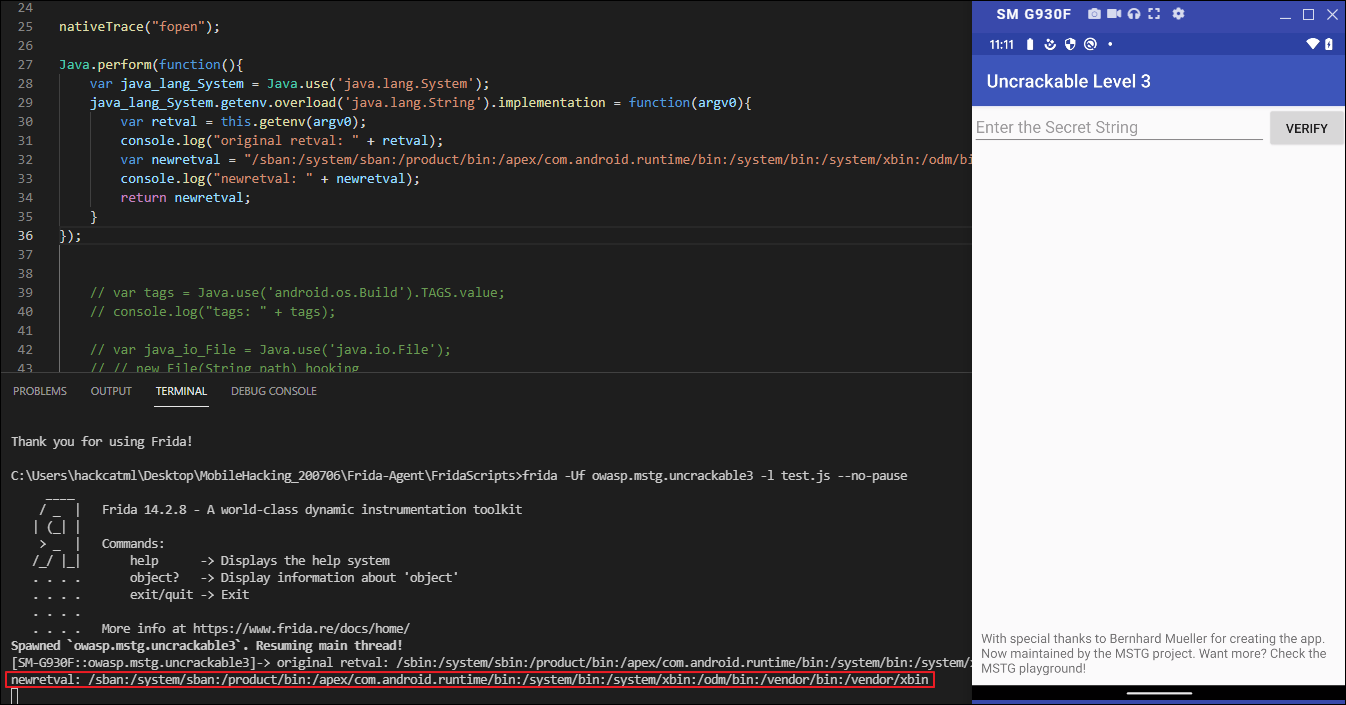 루팅 탐지에서 문제되는 파일은 "/sbin/su" 이므로 System.getenv 메서드를 후킹하여 retval의 "sbin"을 "sban"으로 바꿔주면 우회가 가능하겠습니다.