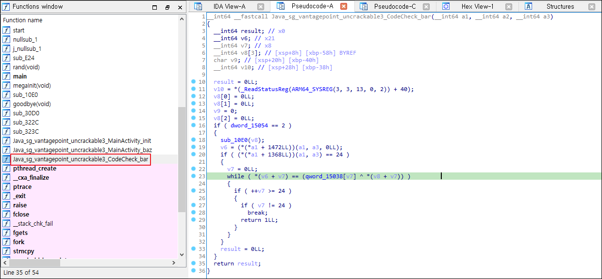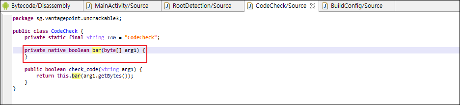 check_code 메서드를 따라 들어가면 결국 native library의 함수와 연결되어 있는것을 확인할 수 있습니다.