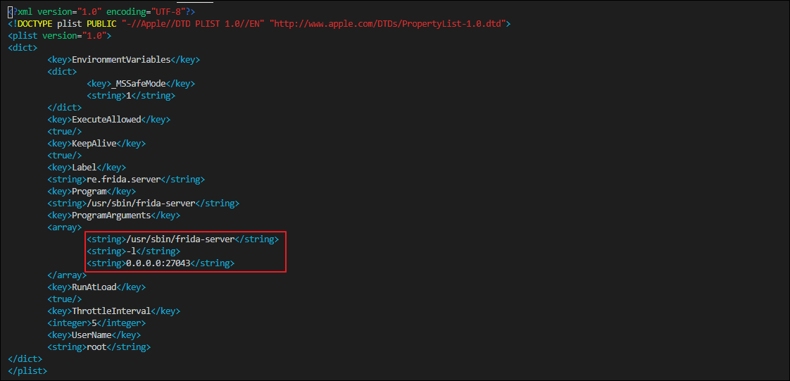 frida-server를 remote모드로 구동하려면 "/Library/LaunchDaemons/re.frida.server.plist" 파일의 "ProgramArguments" Key 항목에 옵션을 추가하고 frida-server를 구동해주면 됩니다.