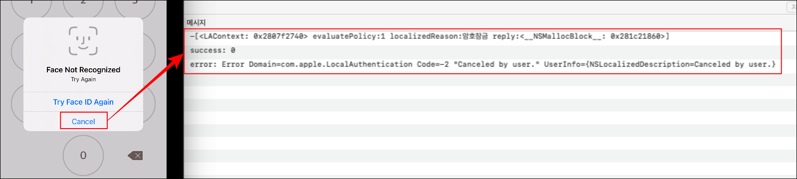 트윅 설치 후 앱을 다시 실행하고, FaceID 인증창에서 "Cancel" 을 터치하면 다음과 같은 로그를 확인할 수 있습니다.