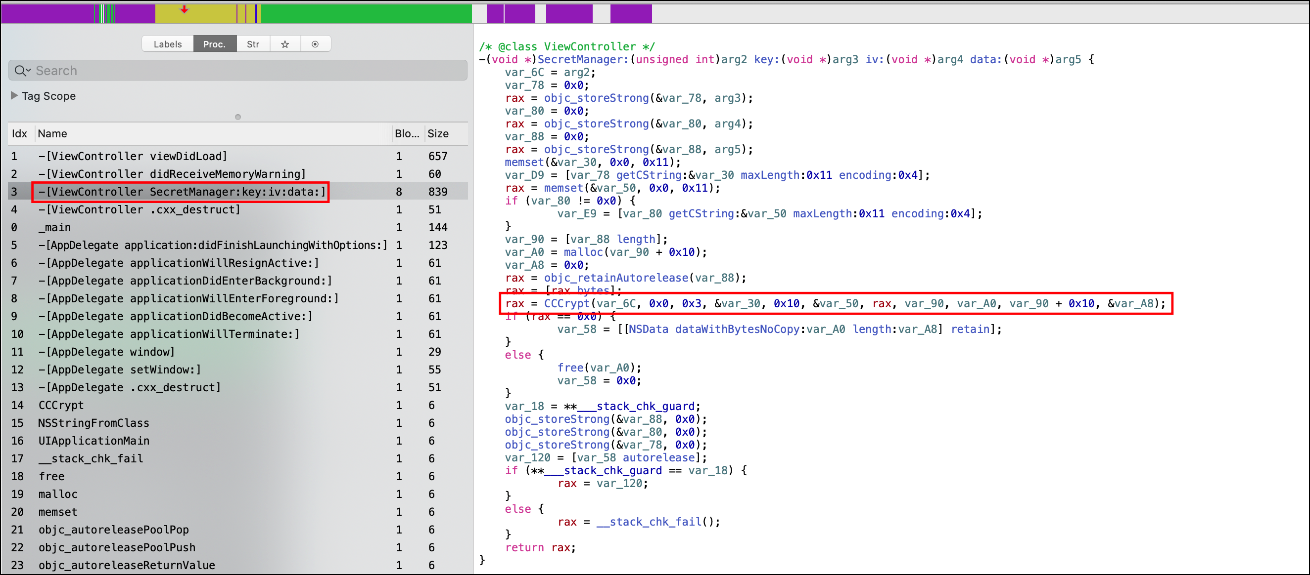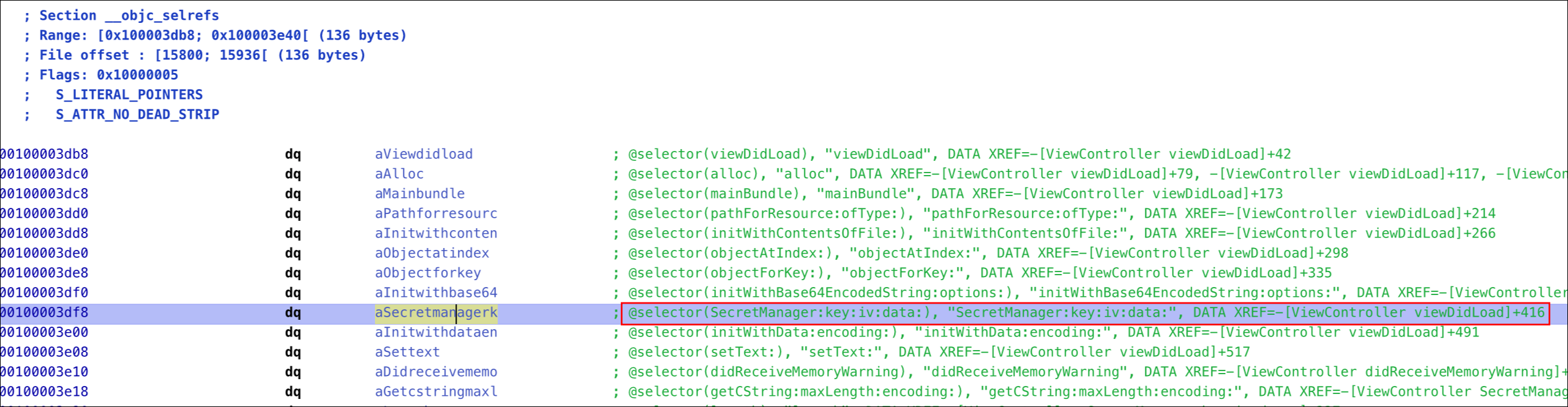 objc_selrefs 섹션을 살펴보면, "-[ViewController SecretManager:key:iv:data:]" 메서드는 "-[ViewController viewDidLoad]+416" 에서 호출하고 있음을 확인 가능합니다.