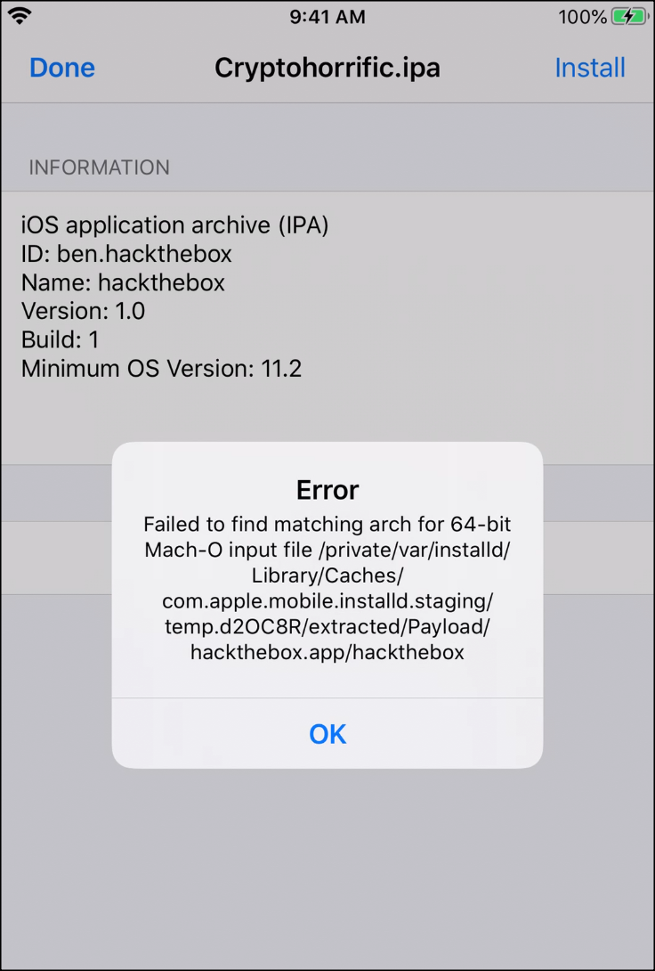 https://app.hackthebox.com/challenges/59 에서 zip파일 다운로드 후에 ipa파일로 확장자 변경해도 설치가 안됩니다.