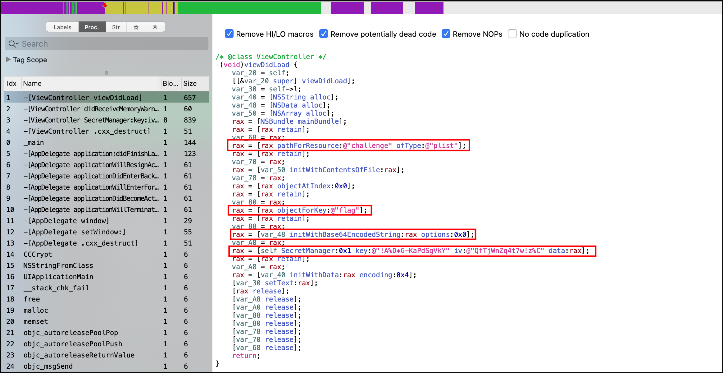 "-[ViewController viewDidLoad]" 메서드를 살펴보면 "challenge.plist" 파일의 "flag" 키값을 읽어서 "-[ViewController SecretManager:key:iv:data:]" 메서드의 data 파라미터에 전달하고 있습니다.