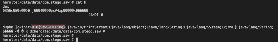 "fl0ating" 문자열 입력 및 "XORIFY" 버튼 클릭 후 위에서 _Z17_Z1aP7_JNIEnvP8_1PKcS0_ 함수의 첫번째 인자로 전달된 "/data/user/0/com.stego.saw/" 경로에 가보면, h 라는 파일이 생성되어 있는 것을 볼 수 있습니다.