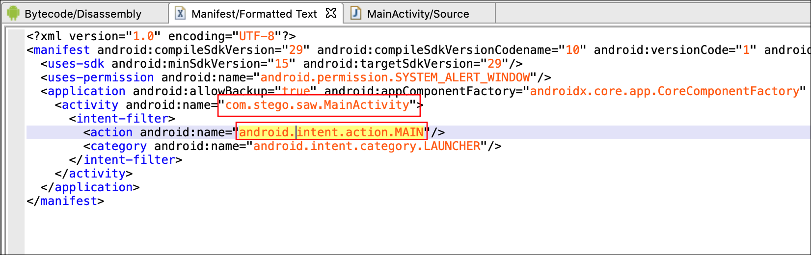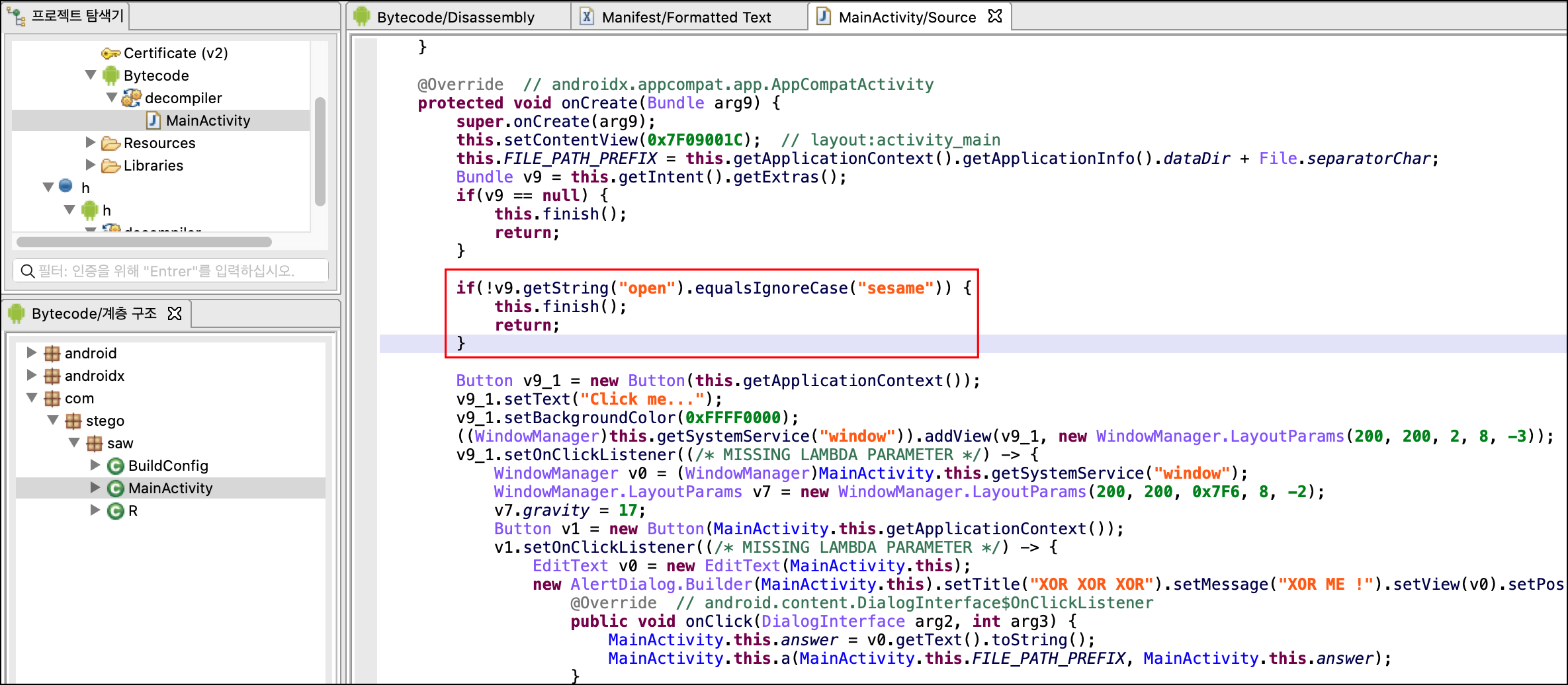 AndroidManifest.xml 파일을 보니 "open": "sesame" 인텐트와 함께 "com.stego.saw.MainActivity" 액티비티의 "android.intent.action.MAIN" 액션을 실행시키면 되는 것으로 보입니다.
