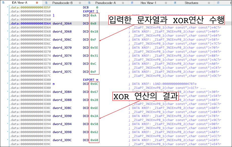 _Z17_Z1aP7_JNIEnvP8_1PKcS0_ 함수의 pseudocode는 다음과 같은데, 내가 입력한 문자열의 각 자리와 XOR연산을 수행하여 하나라도 일치하지 않으면 함수를 종료하고 있습니다.