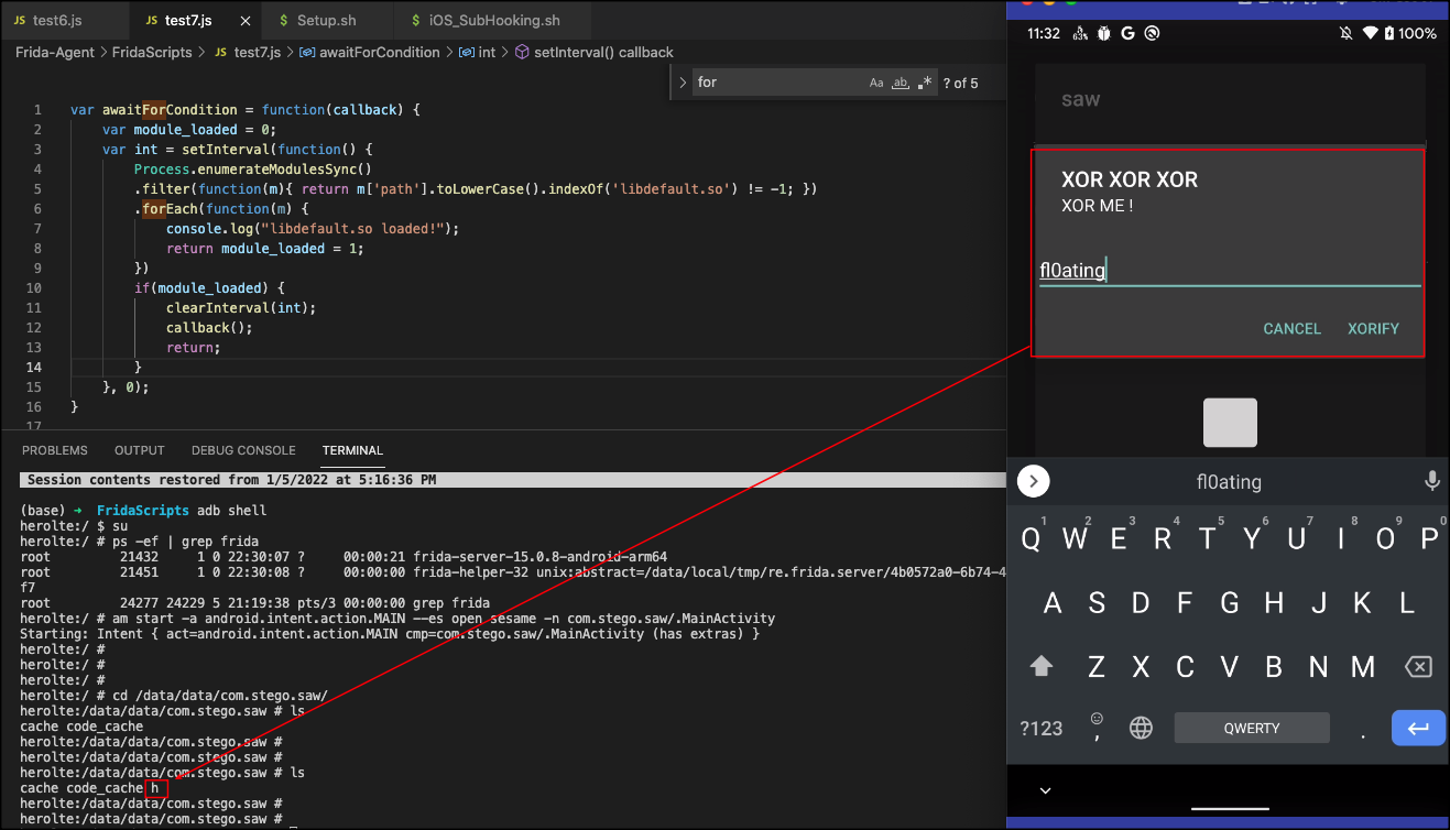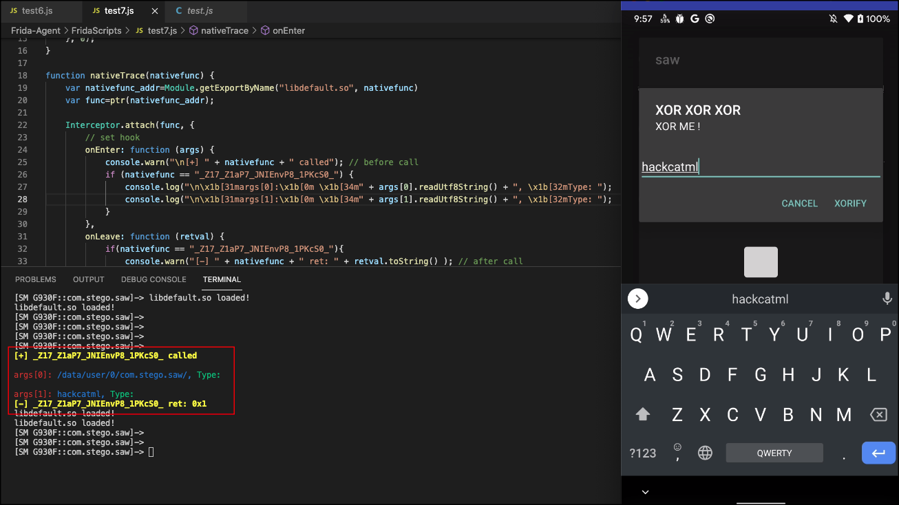 임의의 문자열 입력 후 XORIFY 클릭하면 _Z17_Z1aP7_JNIEnvP8_1PKcS0_ 함수의 첫번째 인자로는 "/data/user/0/com.stego.saw/", 두번째 인자로는 내가 입력한 임의의 문자열이 전달되는 것을 확인 가능합니다.