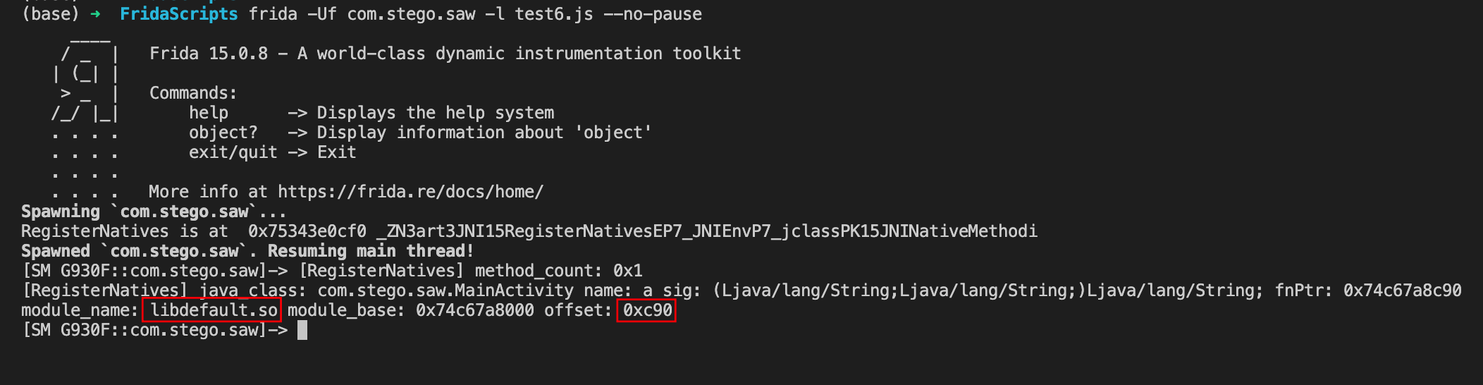 "com.stego.saw.MainActivity.a" 메서드는 libdefault.so 라이브러리의 offset 0xc90 에 위치한 함수와 매핑되고 있습니다.