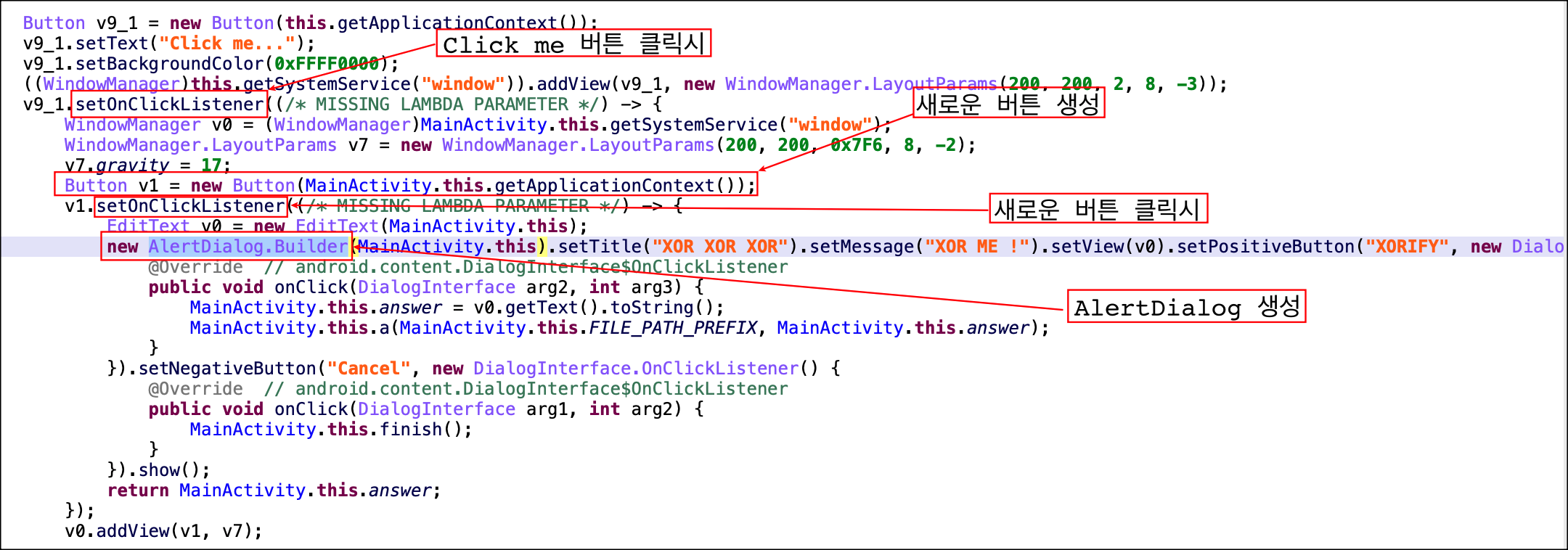 그런데, 다시 "Click me" 버튼을 클릭하면 앱이 종료됩니다. 디컴파일 결과에 의하면 "click me" 버튼 클릭시 새로운 버튼이 생성되며, 새로운 버튼 클릭 시 사용자 값을 입력받는 AlertDialog가 팝업 되어야 합니다.