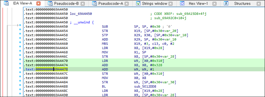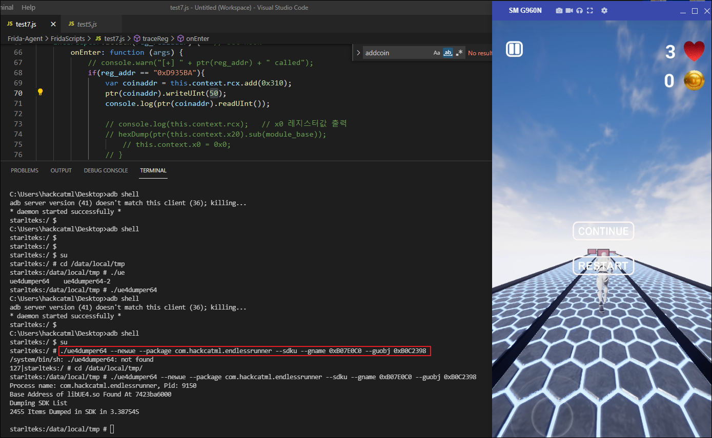 해당 부분의 어셈블리어를 보면 0x69a4478 오프셋에 있는 x9 레지스터 값을 후킹하면 획득하는 코인 갯수값을 조작할 수 있겠습니다.