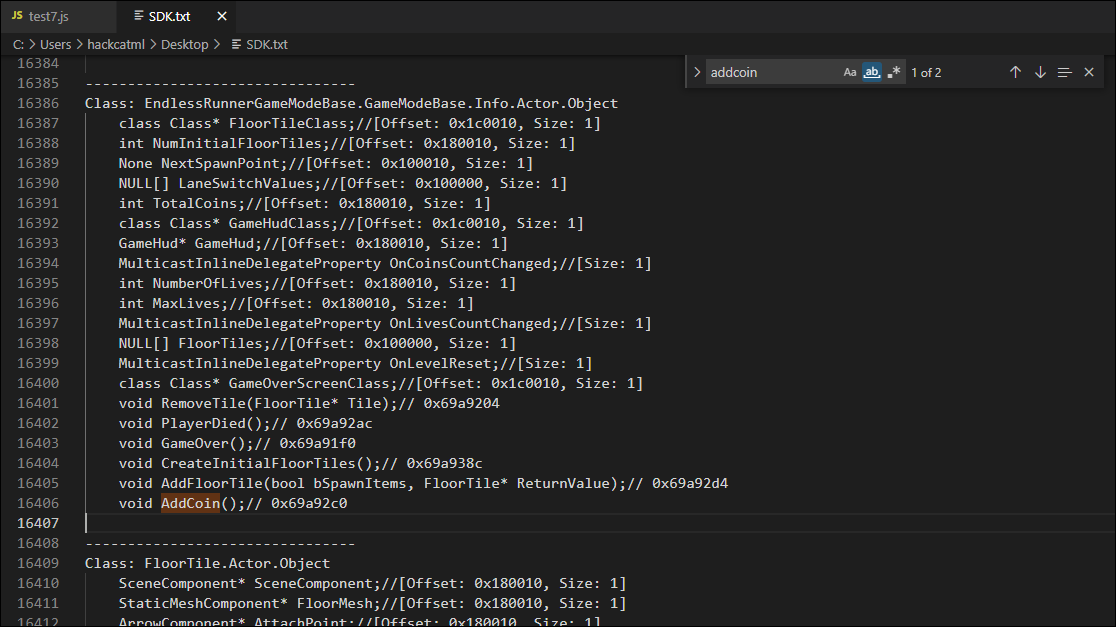 해당 파일을 열어보면 주요 함수명 및 offset 주소값을 확인 가능합니다. void AddCoin() 같은 함수의 Offset은 정확하게 추출되었는데, Offset.h 파일의 offset 설정값이 틀려서인지 Property들의 Offset 값이 그림과 같이 이상하게 나옵니다.