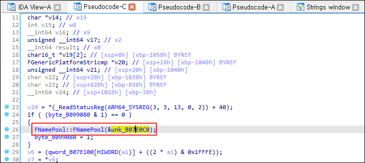 이제 FNamePool 생성자를 호출하는 곳을 역추적해보면 &unk_B07E0c0 가 전달되는데, 이것이 NamePoolData의 offset 주소값(0xB07E0c0) 입니다.