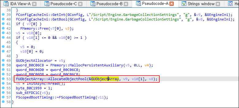 FUObjectArray::AllocateObjectPool 함수를 호출하는 곳을 역추적해보면 GUObjectArray의 오프셋 주소값(0xB0C2398)이 전달되는 것을 확인할 수 있습니다.