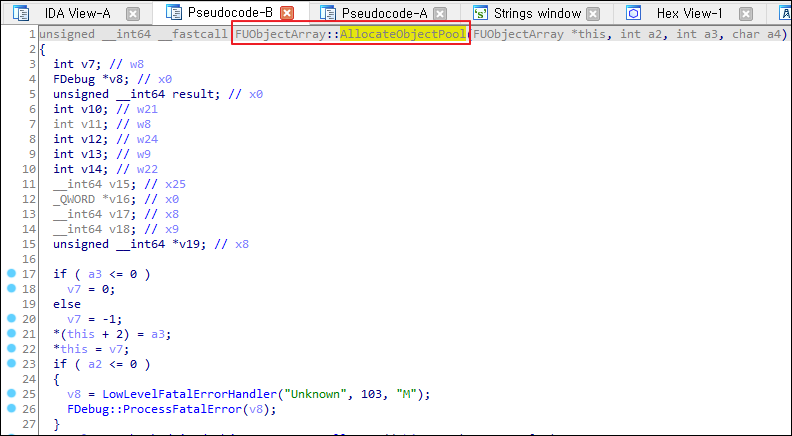 "uobject count is invalid" 문자열 검색합니다. 해당 문자열이 들어있는 곳은 FUObjectArray::AllocateObjectPool() 입니다.