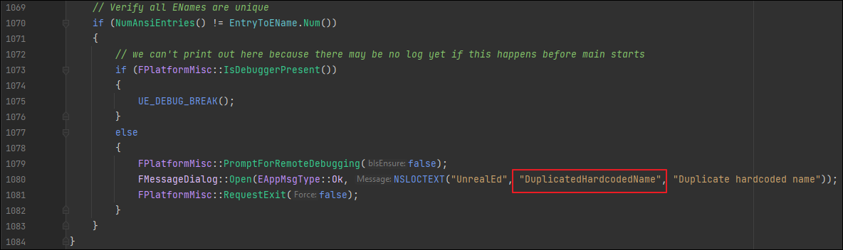 UE4 소스코드에 의하면 UnrealName.cpp 파일의 FNamePool 클래스의 FNamePool 생성자에 "DuplicatedHardcodedName" 문자열이 하드코딩되어 있습니다.