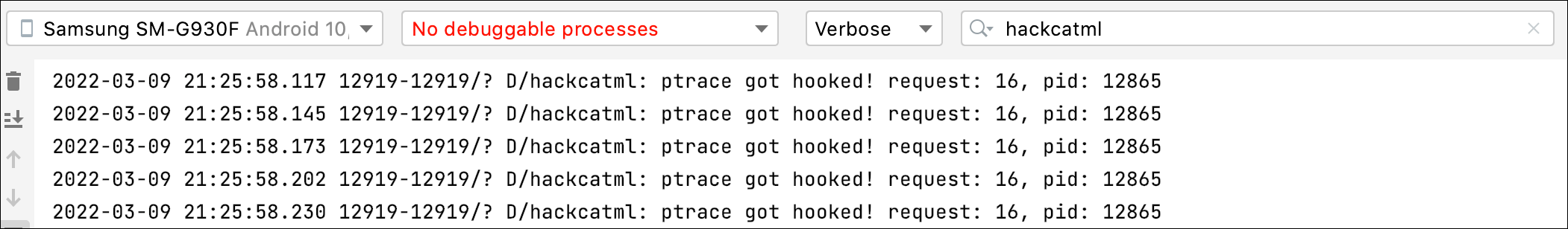 LOGD("ptrace got hooked! request: %d, pid: %d", request, pid);