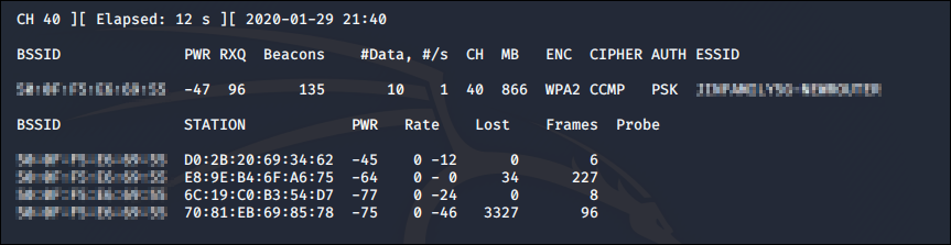 airodump-ng --band a --channel 40 --bssid 50:XX:X5:EX:6X:X5 wlan0