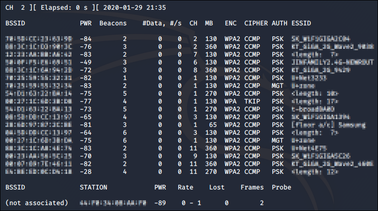 --channel 옵션은 특정 채널만을 스캐닝하고, --band 옵션은 스캐닝 대역대를 지정할 수 있습니다. --bssid옵션은 타겟의 맥주소를 직접 지정하여 스캐닝할 수 있습니다.