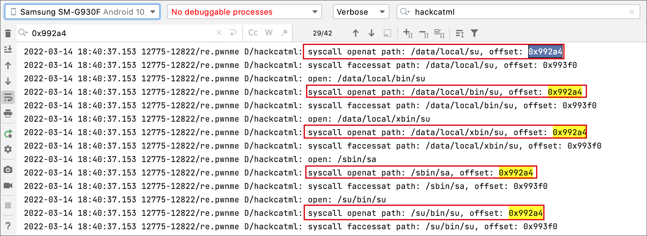 x8 레지스터에 전달되는 값은 56이어서 syscall openat을 호출하고 있으며, x1 레지스터(arg1)에는 "/data/local/su", "/data/local/bin/su" 와 같은 루팅탐지 경로가 전달되고 있습니다.