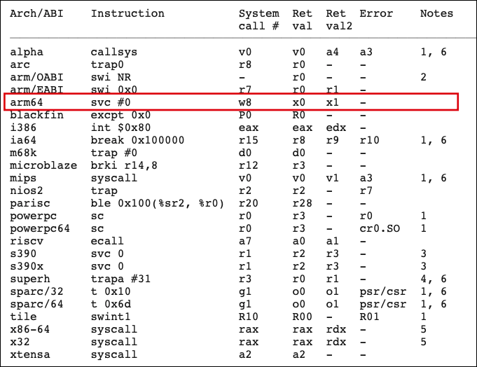 예컨데, Linux syscall table arm64(https://chromium.googlesource.com/chromiumos/docs/%2B/master/constants/syscalls.md#arm64-64_bit )에 따르면 x8 == 56 이면 syscall openat, x8 == 48 이면 syscall faccessat, x8 == 63 이면 syscall read, x8 == 78이면 syscall readlinkat 입니다.