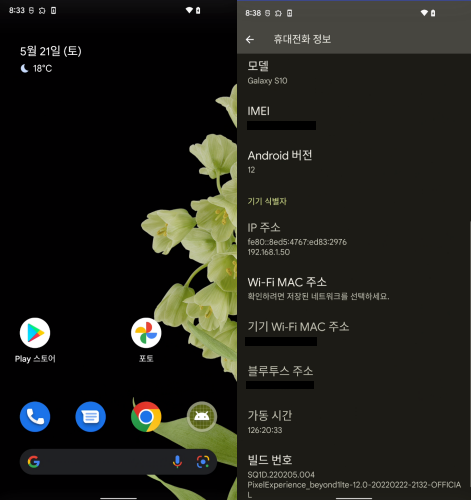 Reboot --> 루팅완료(아래 사진은 루팅완료 후 Pixel Experience AOS12 커롬 올린 사진입니다)