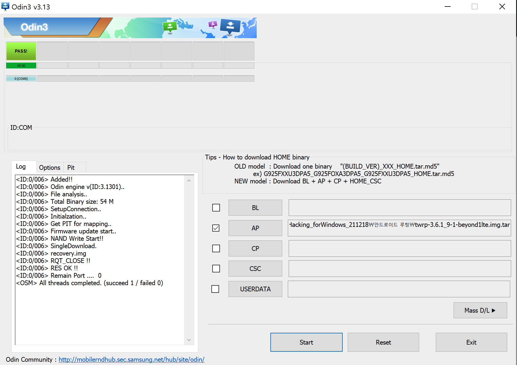 --> 오딘 AP 항목에 TWRP.tar 파일 선택 --> TWRP 플래싱