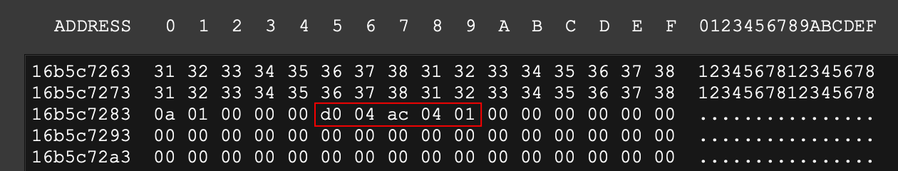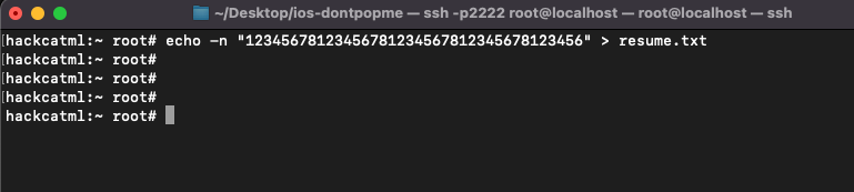 resume.txt 에 6글자를 더 채우면, 위 그림에서 "d0 04 ac 04 01"(0x104ac04d0)가 "36 04 ac 04 01"(0x104ac0436) 으로 오염될테고 크래시가 나겠죠? 채워봅시다. (echo -n 옵션을 사용하면 문자열 끝에 붙는 line feed 문자 "0a"를 제거합니다)