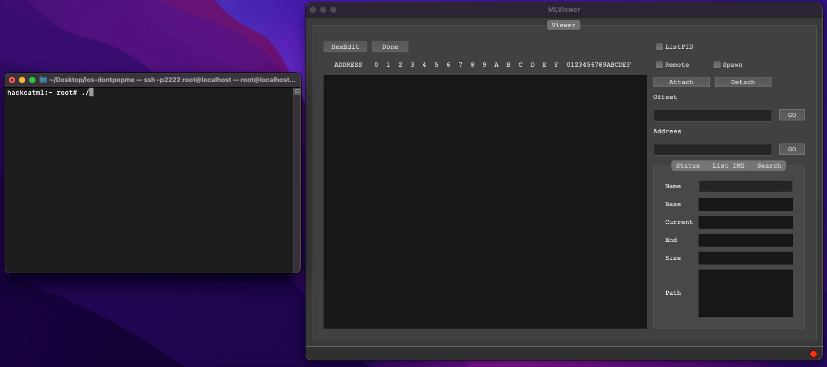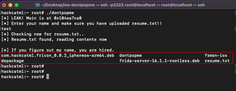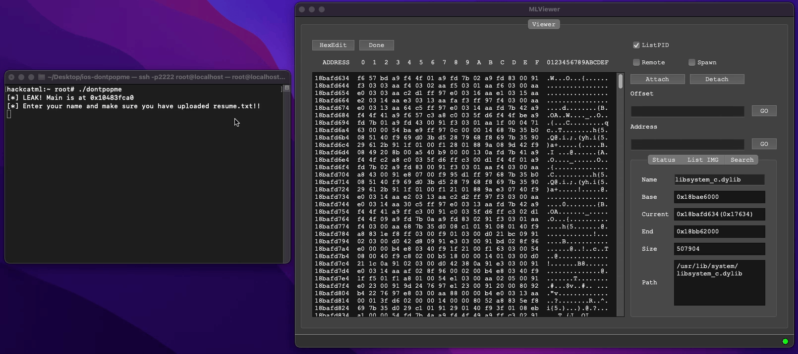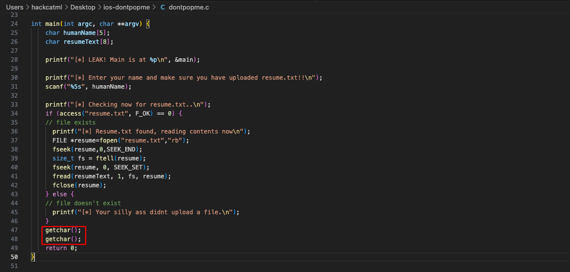 실습자료는 https://github.com/inversecos/ios-dontpopme 여기서 다운받을 수 있습니다만, 이해가 쉽도록 프로그램이 바로 종료되지 않게 살짝 수정한 버전으로 테스트해보려고 합니다. (getchar() 2개 추가)