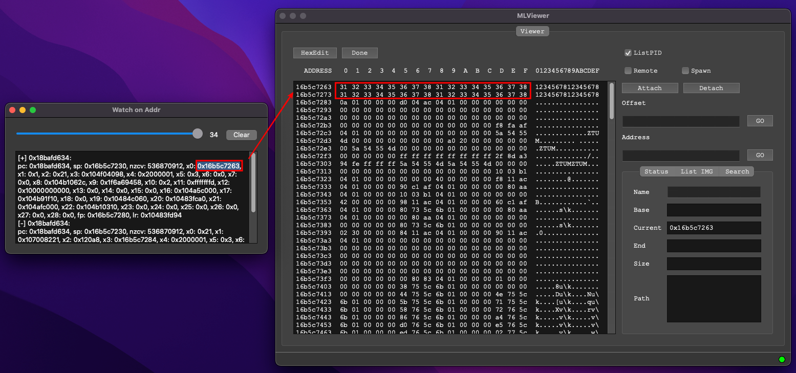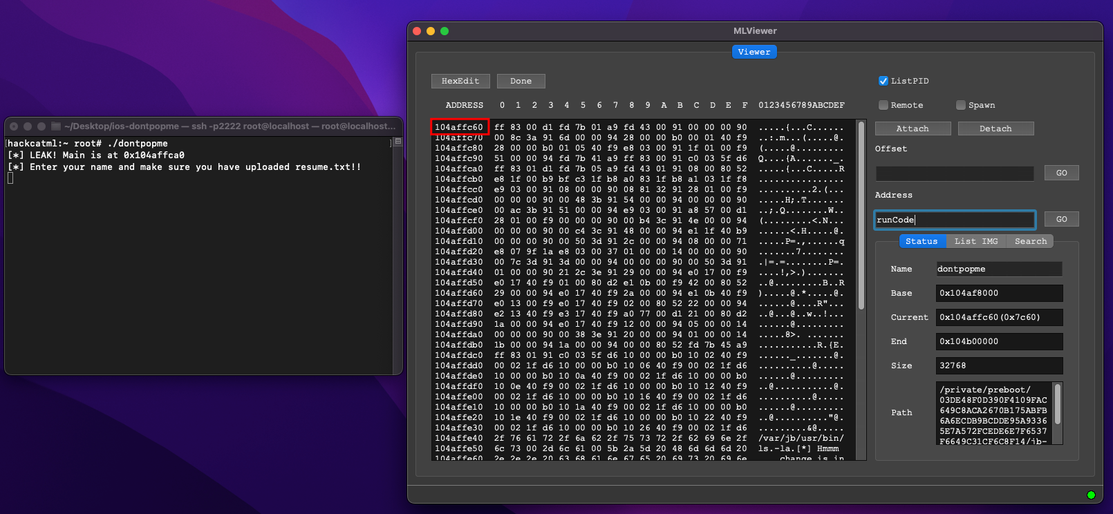 프로그램을 실행하고, 메모리 뷰어를 붙이고, "runCode" 함수의 주소를 확인합니다. 0x104affc60 이군요