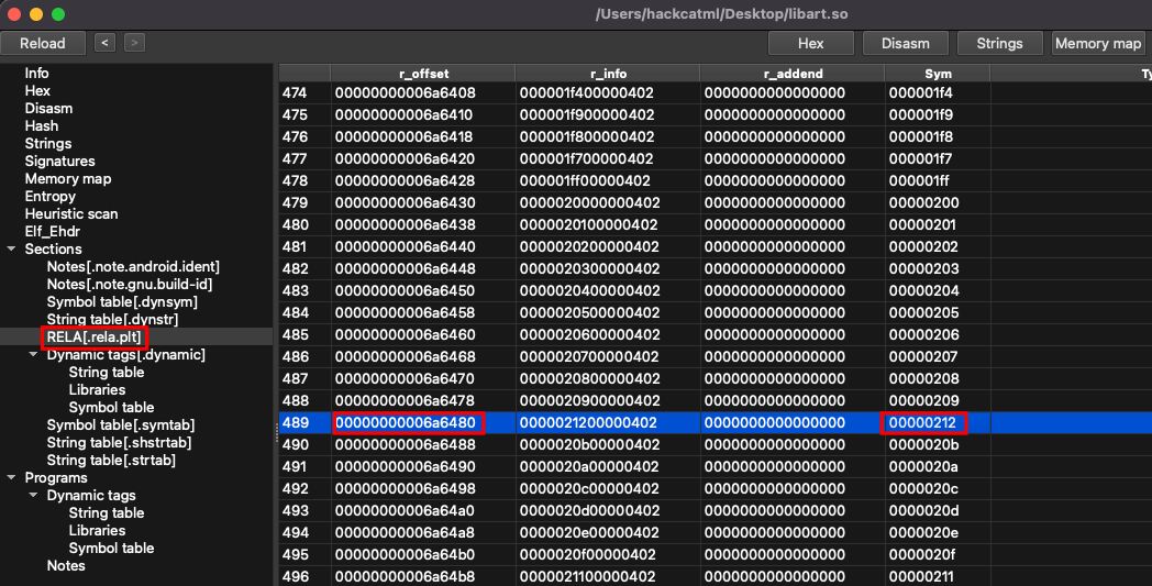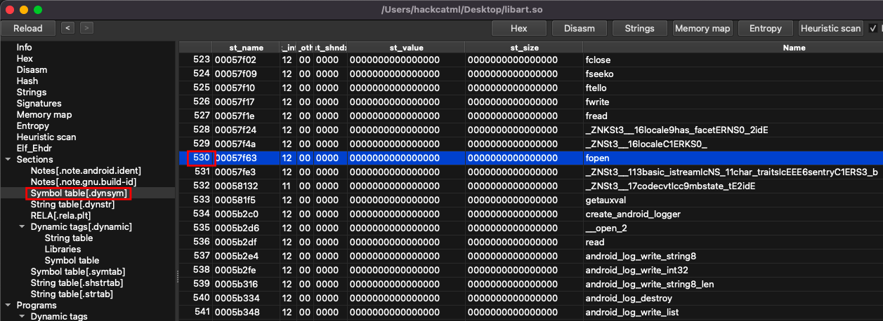 XELFViewer(https://github.com/horsicq/XELFViewer) 로 libart.so 파일의 .dynsym 섹션을 보죠.