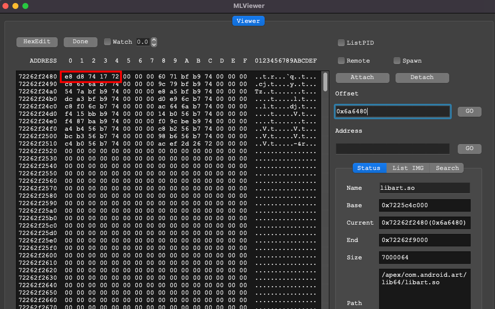 자 이제 libart.so 의 offset 0x6a6480 으로 이동해봅시다. 0x721774d8e8 이라는 주소가 저장되어 있네요.