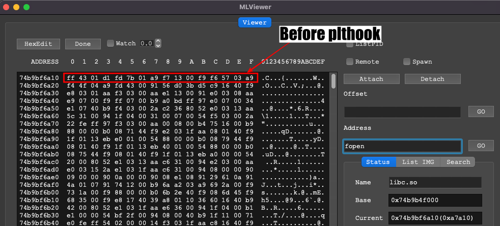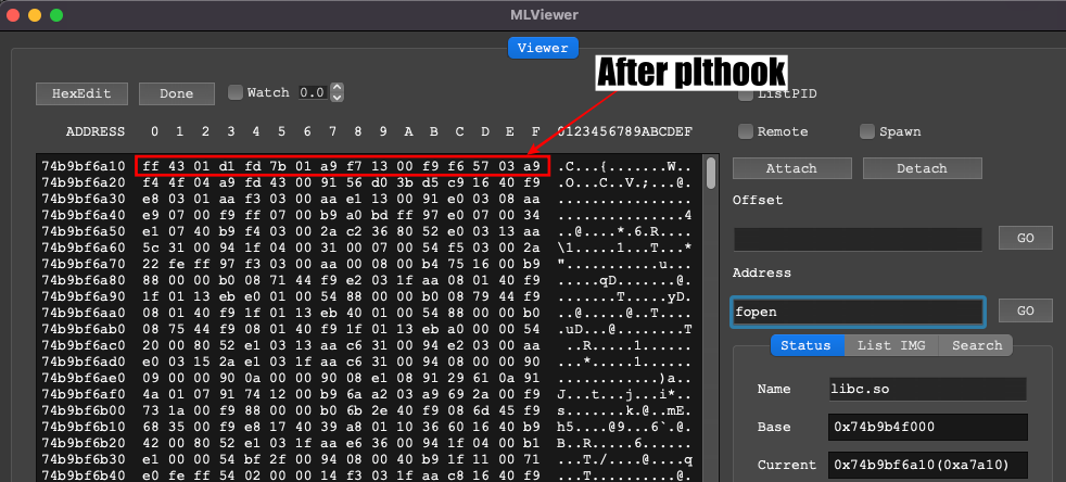 plthook 전이나 후나 libc.so 에 있는 fopen 함수 시작부의 메모리는 차이가 없습니다. (즉, c함수 인라인후킹 아님)