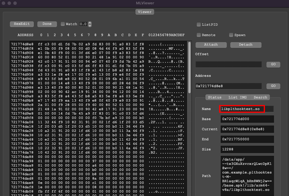어쨌든 저장되어 있는 주소 0x721774d8e8 로 이동해보죠. GOT 테이블에 저장되어 있는 fopen 함수의 주소로 이동했더니 위치가 제가 만든 libplthooktest.so 라이브러리에 속해 있습니다. fake_fopen 주소인 것이죠.