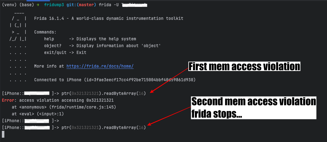 원인이 뭔가 하니...palera1n jb에서는 frida 로 메모리에 접근 시 memory access violation 이 2번 이상 발생하면 앱이랑 frida가 멈춰 버리더군요.
