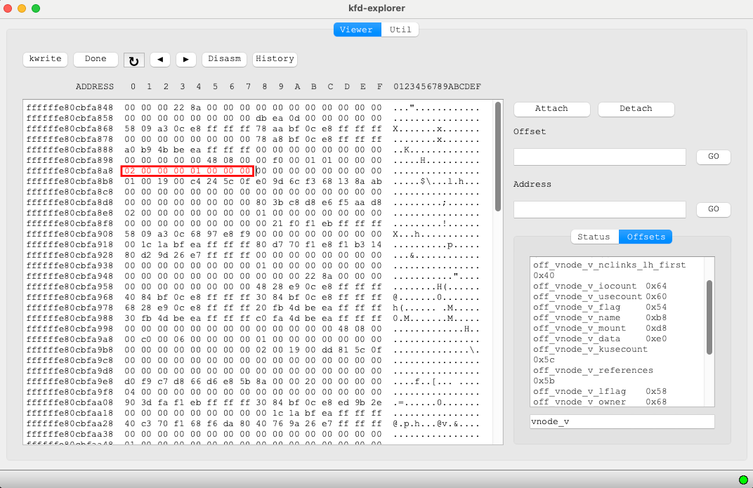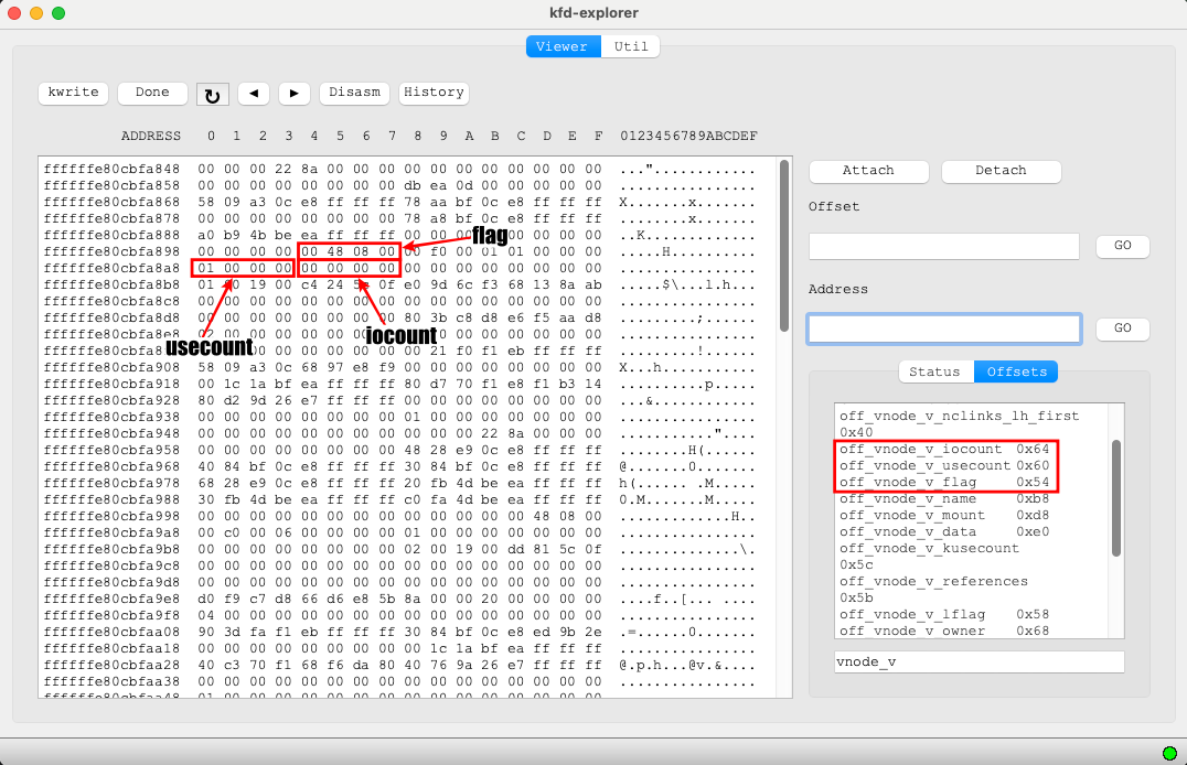 해당 vnode 주소로 이동해보면 iocount, usecount, flag 필드가 보입니다. Offsets 탭에서 해당 필드들이 vnode 로부터 얼만큼 떨어져 있는지 확인할 수 있습니다.