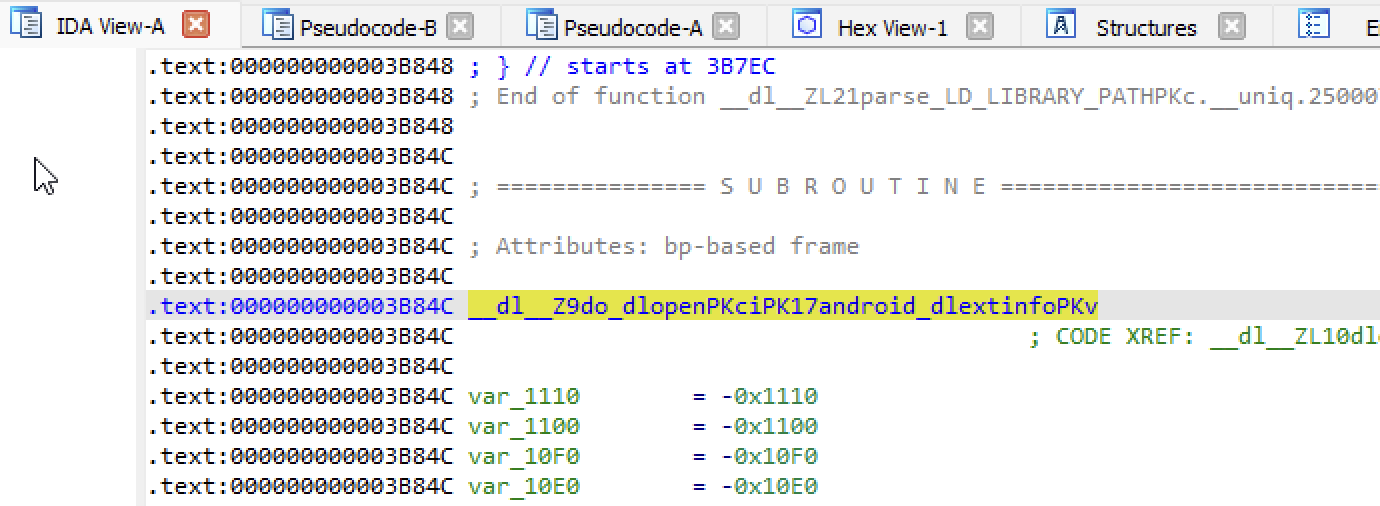 do_dlopen 함수의 심볼은 "__dl__Z9do_dlopenPKciPK17android_dlextinfoPKv" 입니다.