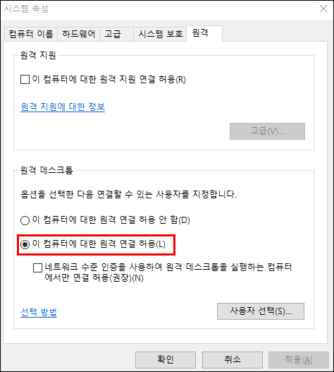 컴퓨터를 켜기만 해서는 아무 소용이 없습니다. 원격에서 컴퓨터에 접속해서 작업을 할 수 있어야 하겠죠. 윈도우에서 제공하는 원격 데스크톱 연결 기능이 RDP입니다. 실행창에 sysdm.cpl 입력하여 RDP기능을 활성화 시켜 줍니다.