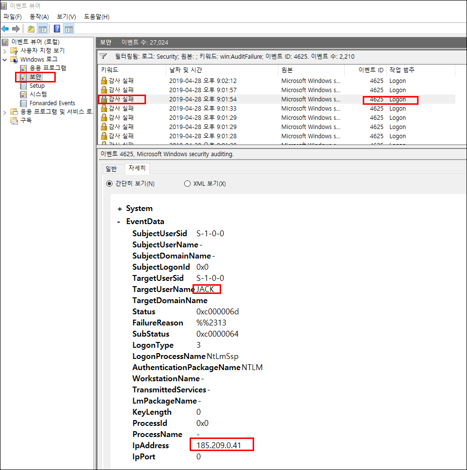 아무래도 포트포워딩을 정직하게 3389포트로 하였더니 외부에서 모르는 IP로 해킹 시도가 많이 들어오네요. 해킹시도는 실행창에 eventvwr.msc 입력하고 보안로그를 보면 알 수 있습니다.