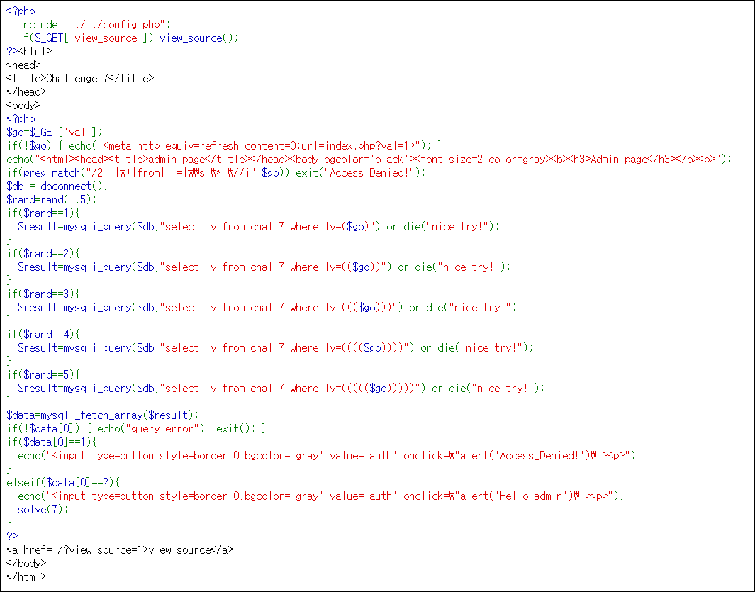 따라서 여러번 시도하면, 괄호가 한개인 select lv from chall7 where lv=($go) 에 걸릴 것이고,
